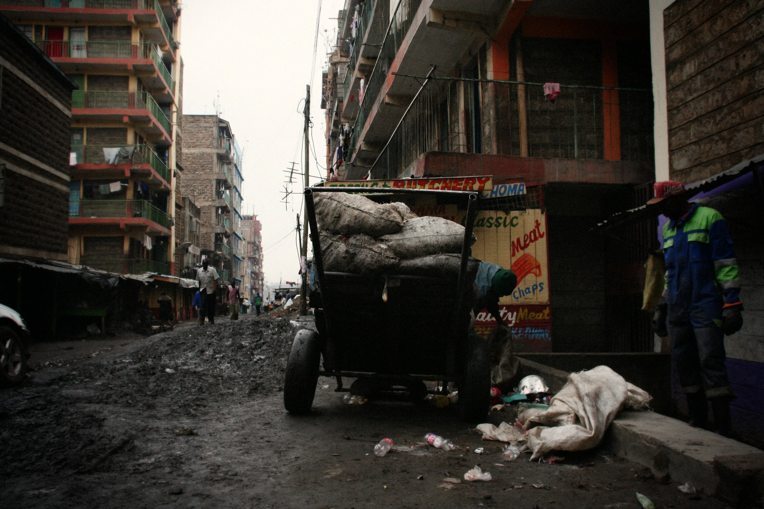 Mathare Number 10 is one of the poorest neighborhoods in the Mathare Valley in Nairobi, Kenya. Most of Mathare, one of the oldest and largest slums in Nairobi, lacks basic infrastructure like access to clean water, electricity, medical clinics, public schools, and garbage/recycling collection. The Mathare Number 10 Youth Group (MANYGRO) is one of many youth groups (in Kenya, youth refers to young adults aged 18 to 35) that has used this lack of infrastructure as an economic opportunity. These side jobs, or ways of making a bit of extra cash, are referred to as hustles by Nairobi youth. Once a week, the self-described “hustlers” of MANYGRO charge a nominal fee to collect garbage for over 300 households in the Mathare Number 10 neighborhood. They start their day in the dark, at around 4 am, collecting household waste on a handheld cart called a mkokoteni. They rent a collection truck, sharing the price with a number of other youth groups, and in the afternoon, haul all of the collected waste to the Dandora landfill in eastern Nairobi.